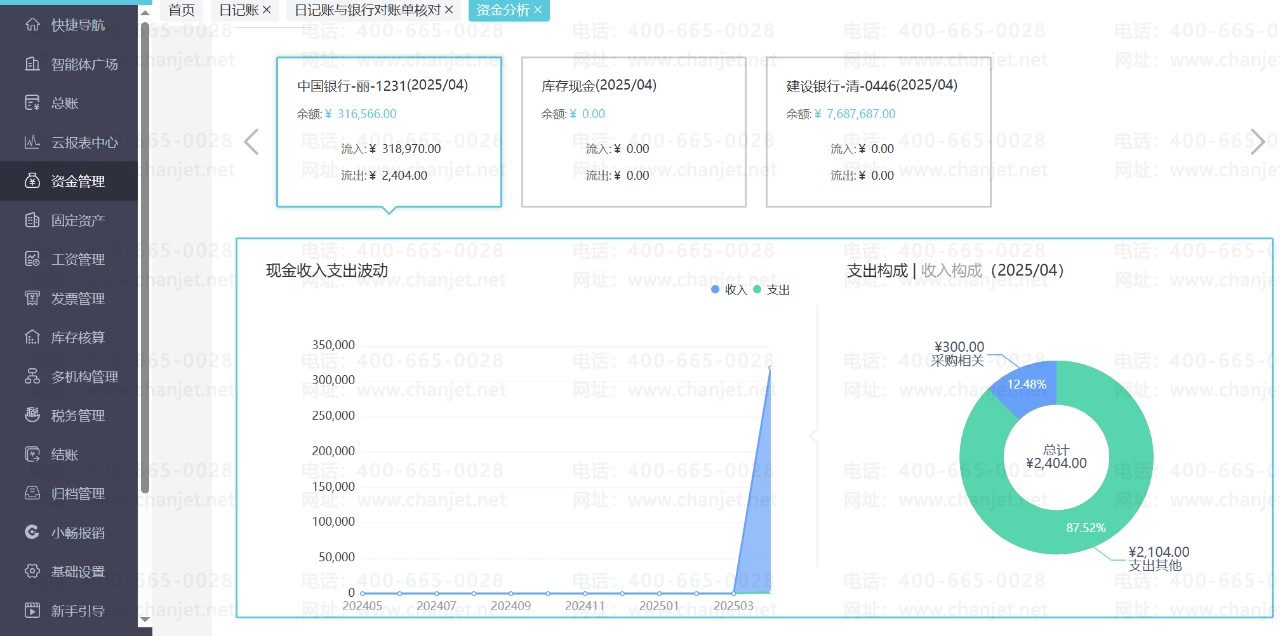 资金管理模块直连银行系统,同步流水数据,智能匹配业务场景生成凭证。
