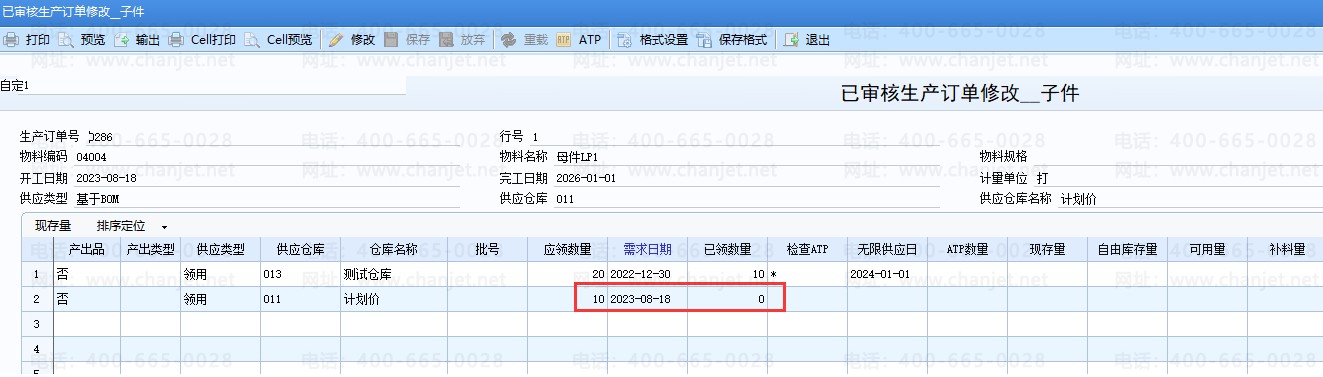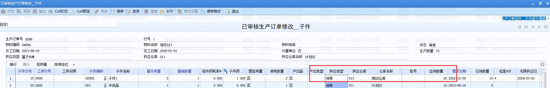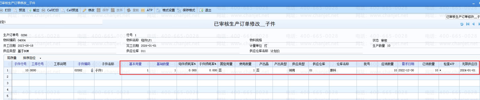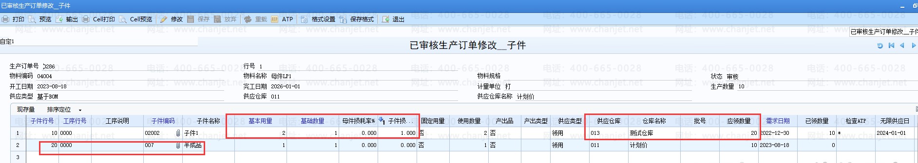 子件资料可以修改主要的字段应领数量、基本用量、基础数量、仓库、损耗率、供应类型、领料申请标识以及一些自定义项字段。