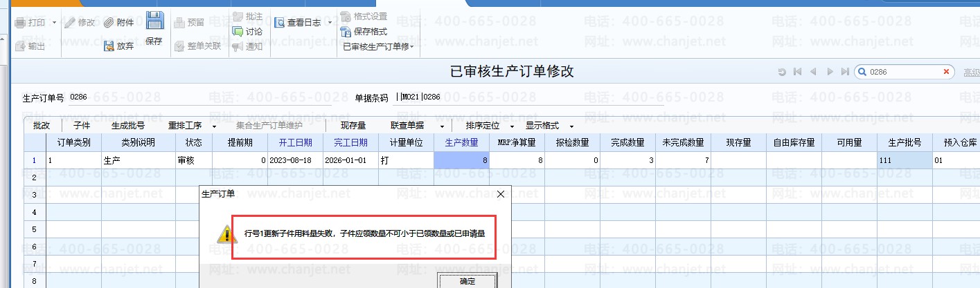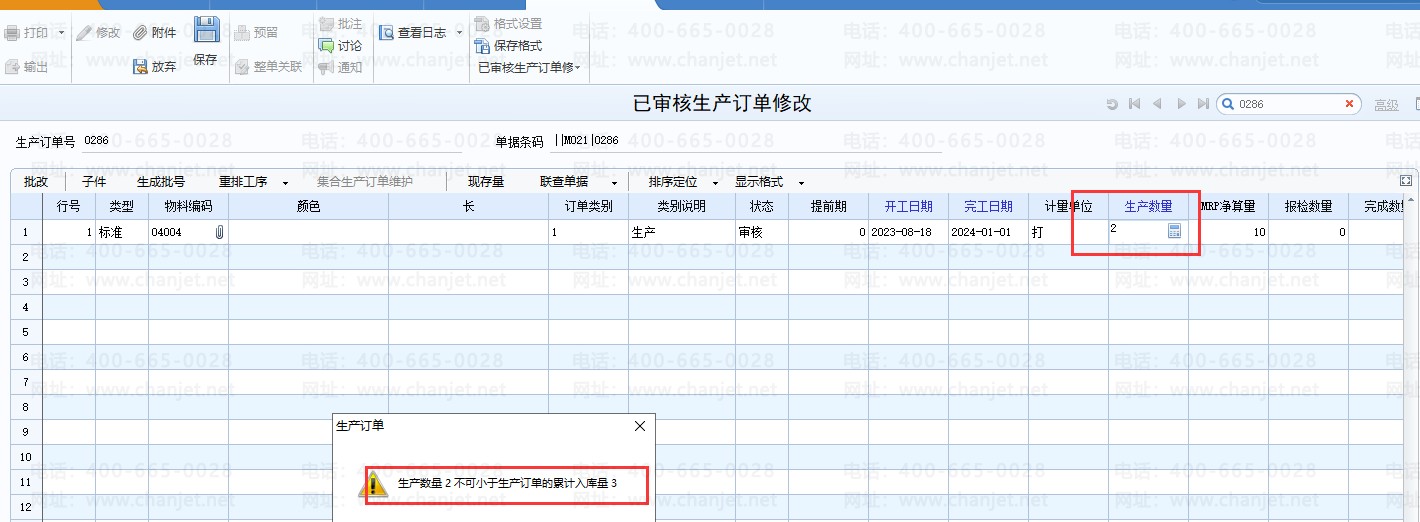对已审核生产订单修改,修改数量字段,当数量小于已入库量会报错提示。若是已领料。修改生产的数量计算的应领数量小于已领,会提示应领不可小于已领或已申请量