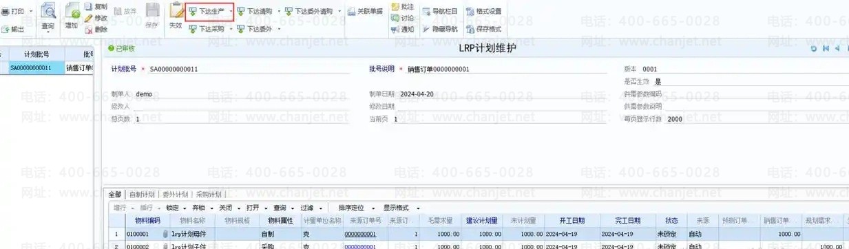 在MRP/LRP计划维护界面,可以直接点击下达生产生成生产订单。
