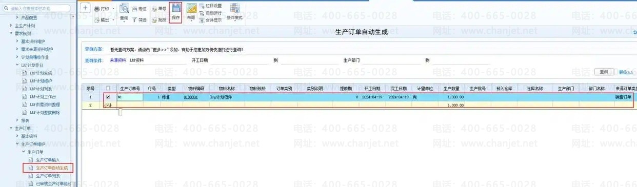 跑计划后,可以在生产制造-生产订单维护-生产订单-生产订单自动生成中选中需要生成生产订单的记录,点击保存即可生成生产订单;