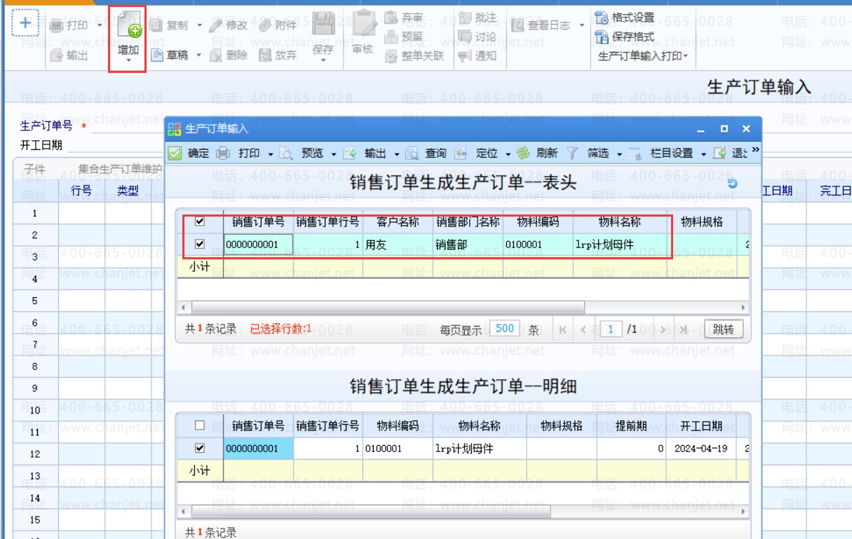 在生产订单输入界面可以点击增加选择参照销售订单生成生产订单。