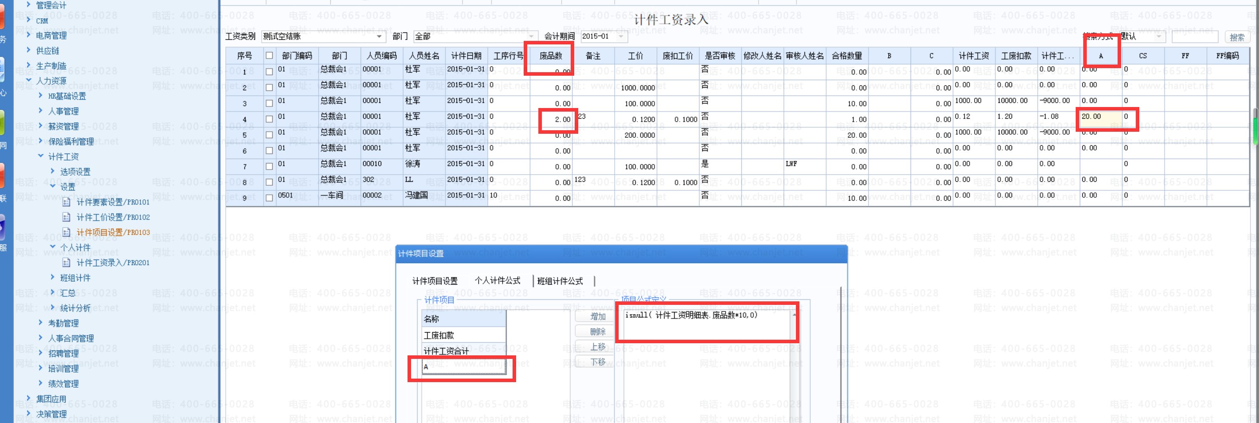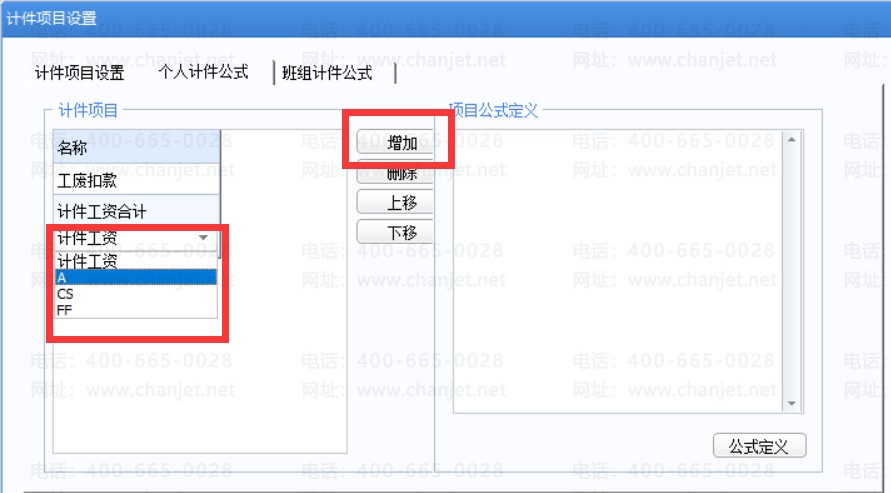 2、点击增加,选择【计件项目】,在公式定义中设置对应公式