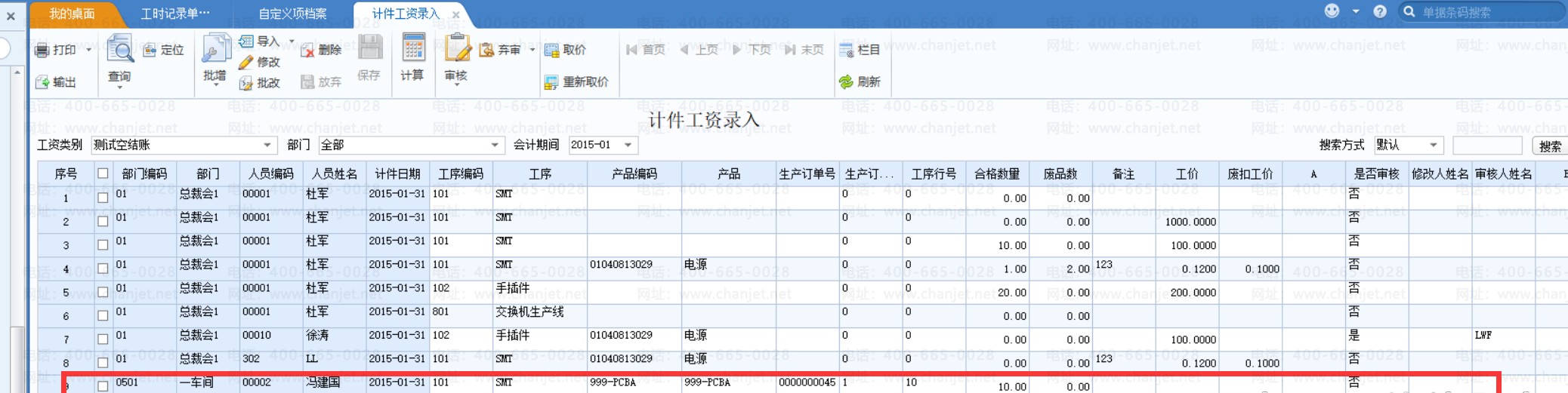 3、进入车间管理模块,录入生产订单工时记录单及员工明细,录入员工数据时要