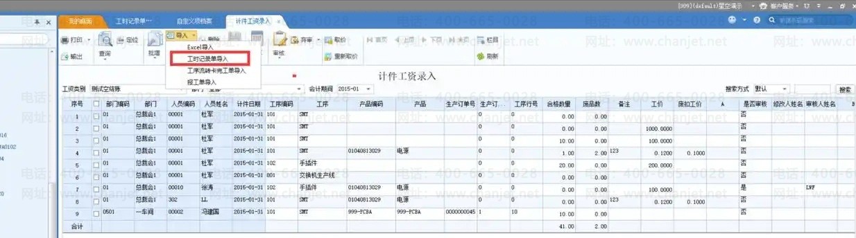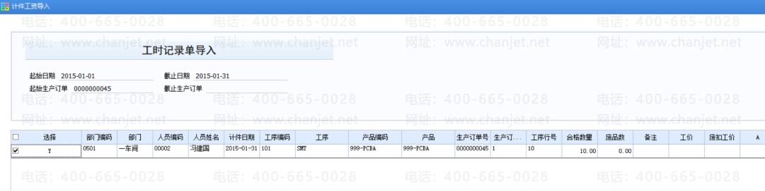 4、进入计件工资-业务-计件数据录入节点从“导入”菜单中选择“工时记录单导入”,输入日期及订单号范围,载入数据