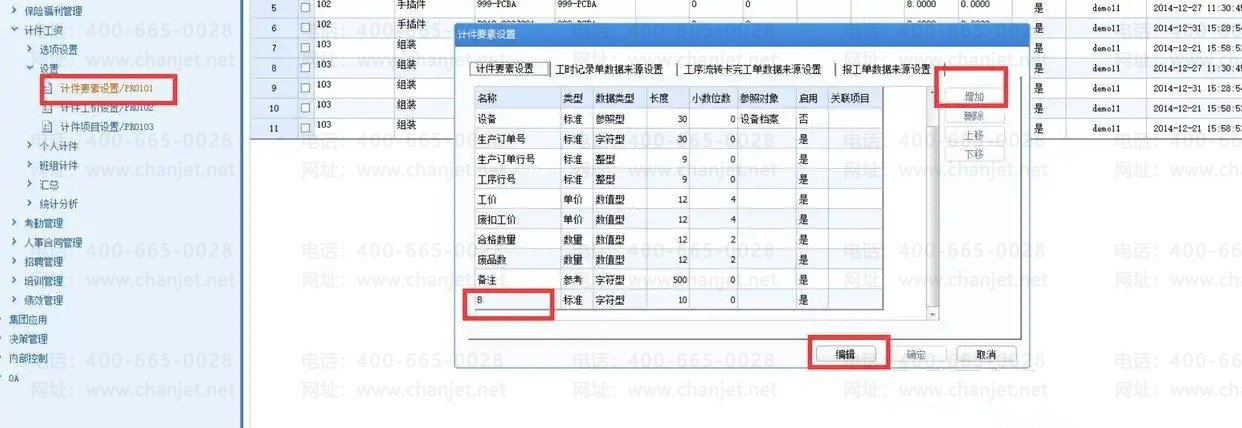 1、【计件要素设置】中点击“编辑”、“增加”、维护好名称、类型。如果该要素需要关联存货档案,类型选项“参照”