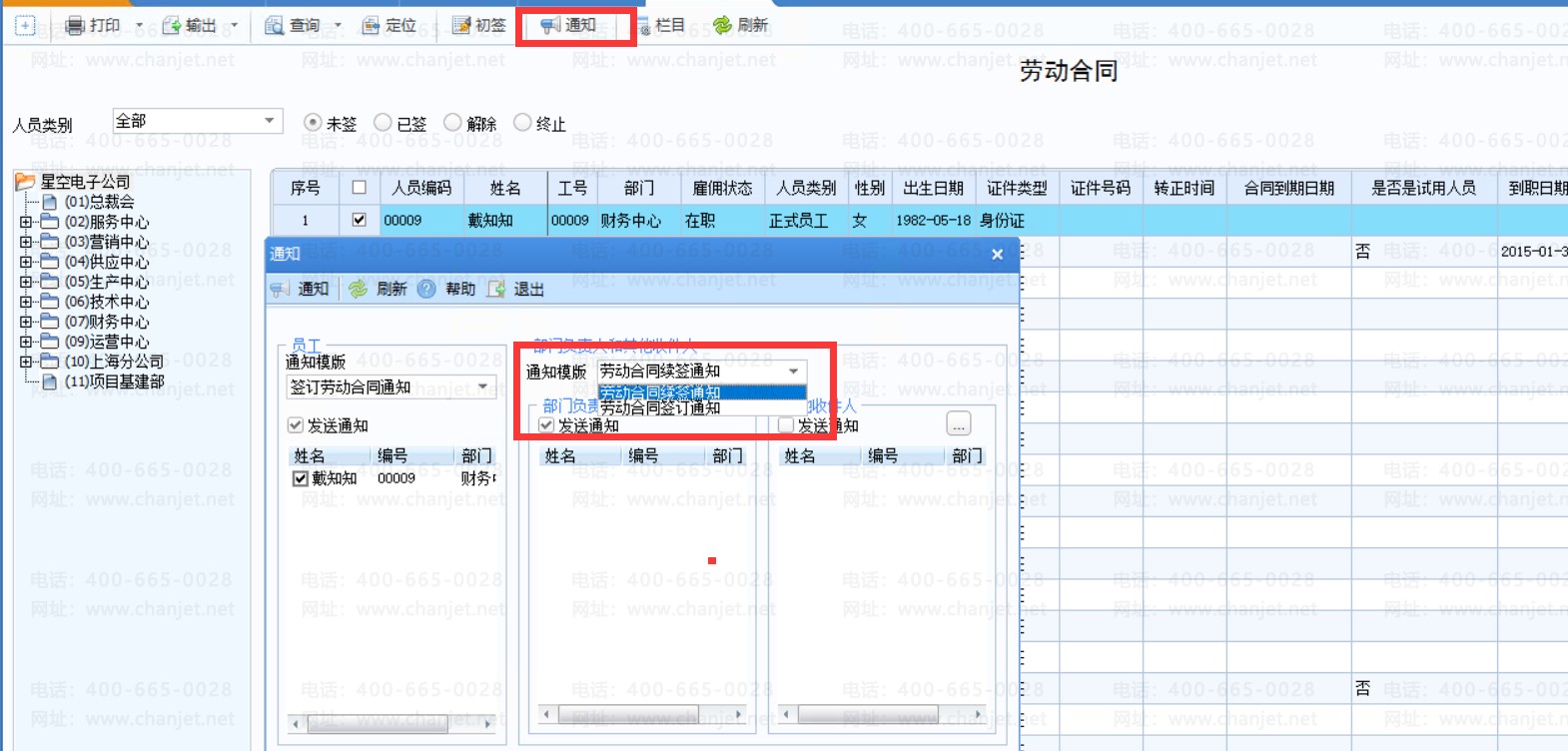 4、在劳动合同界面点击【通知】,发送通知到对应人员