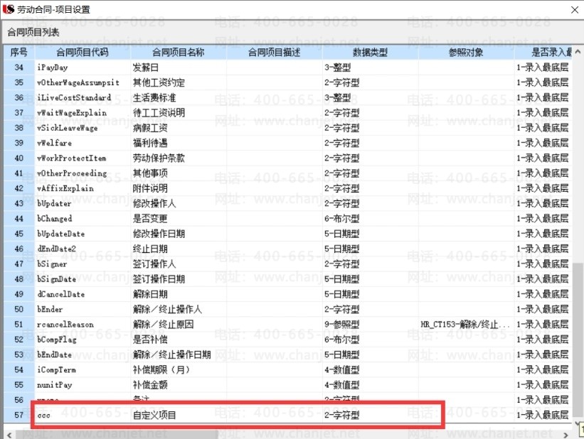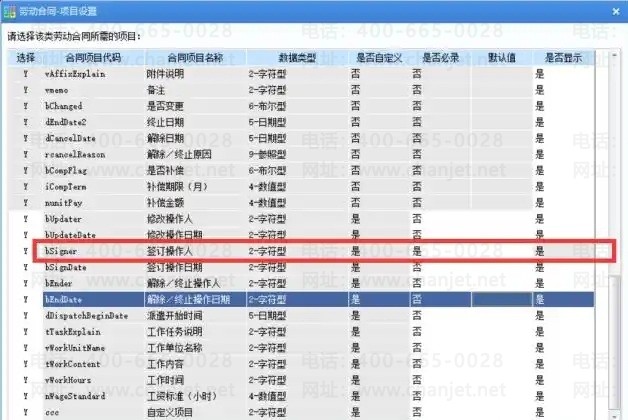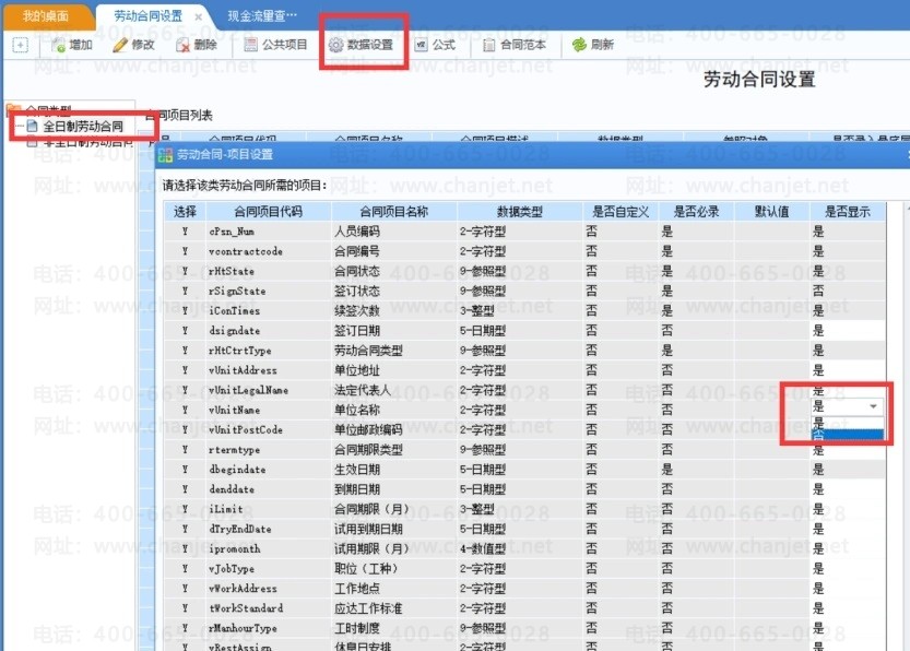 • 选择合同类型,在打开数据设置,选择要隐藏的合同项目,把是否显示选择为“否”即可