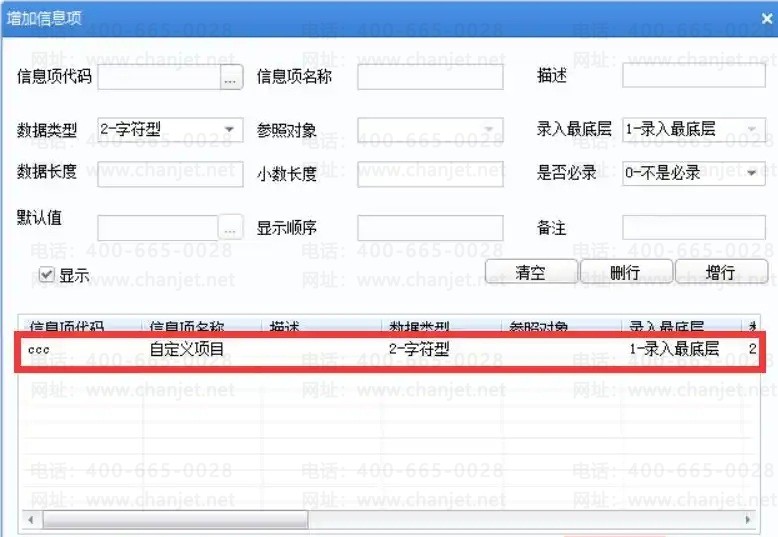 • 增行之后会在表体部分显示出刚刚增加的信息项内容,再点击确定即可