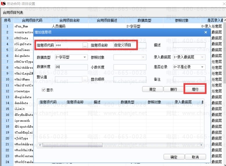 • 点击增加,录入增加信息项的各项内容,再去点击增行;