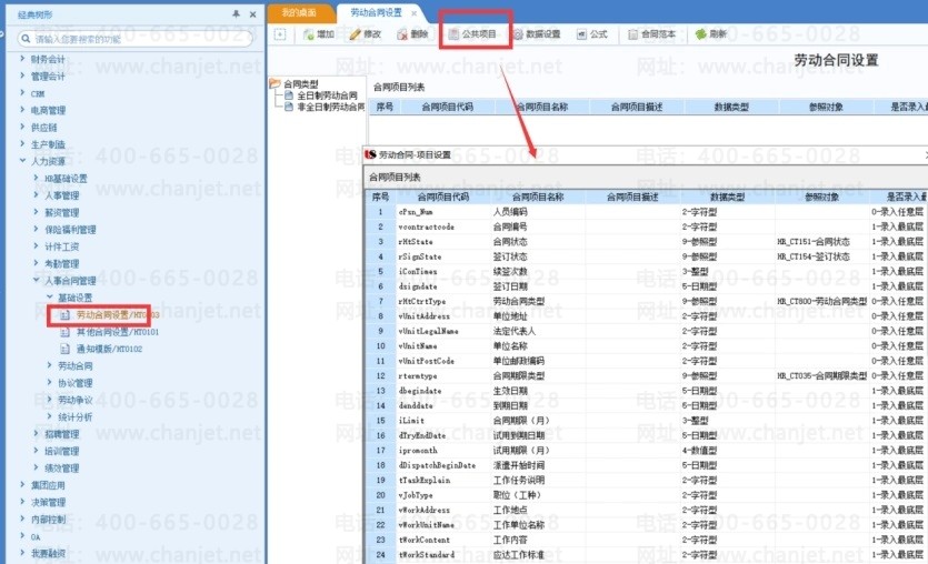 1、进入人事合同管理-基础设置-劳动合同设置,打开公共项目,可以看到劳动合同里的所有项目;