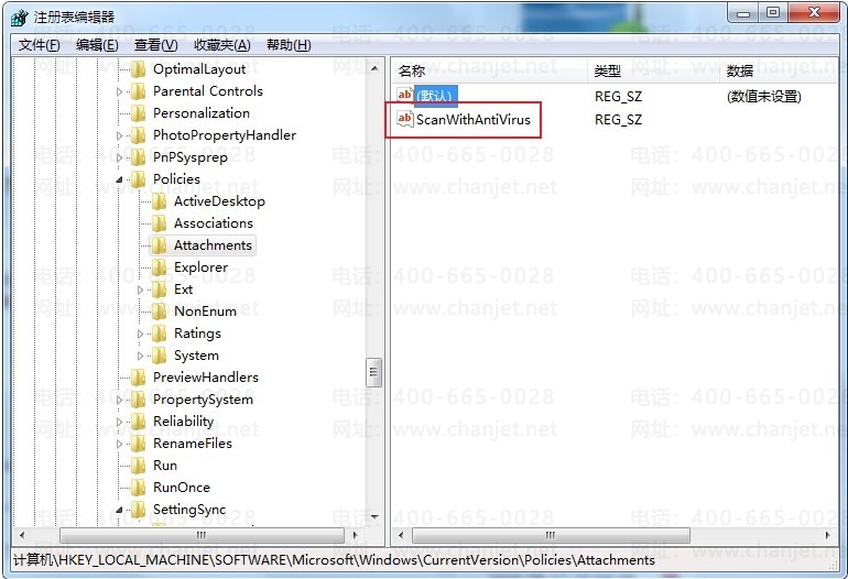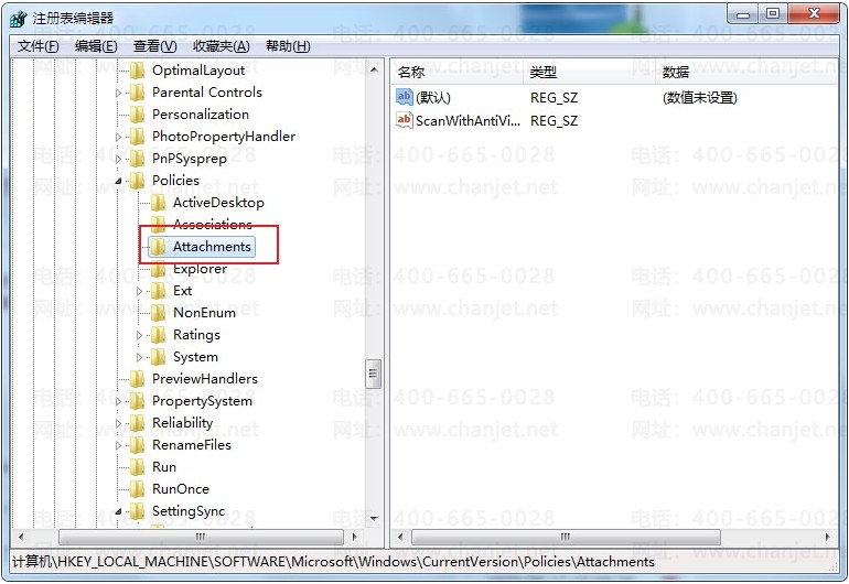 1. 进入注册表编辑器,依次点击左侧中的"HKEY_LOCAL_MACHINESoftwareMicrosoftWindowsCurrentVersionPoliciesAttachments",并回车定位到此。