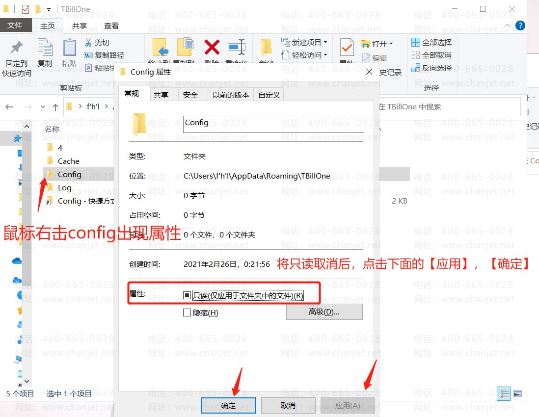 若找不到Config文件,则回到上个菜单栏%appdata%\TBillOne找到Config文件右击鼠标,点击最下的属性,将【已读】去掉,点击【应用】,【确定】。