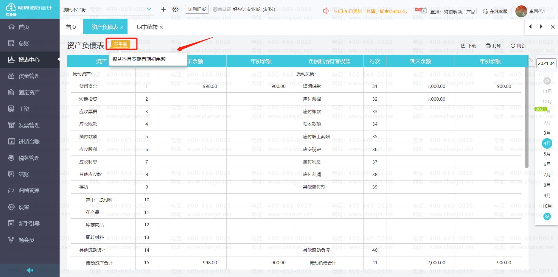 结账的时候提示资产负债表不平衡,到报表中心点击不平衡提示【损益科目本期有期初余额】