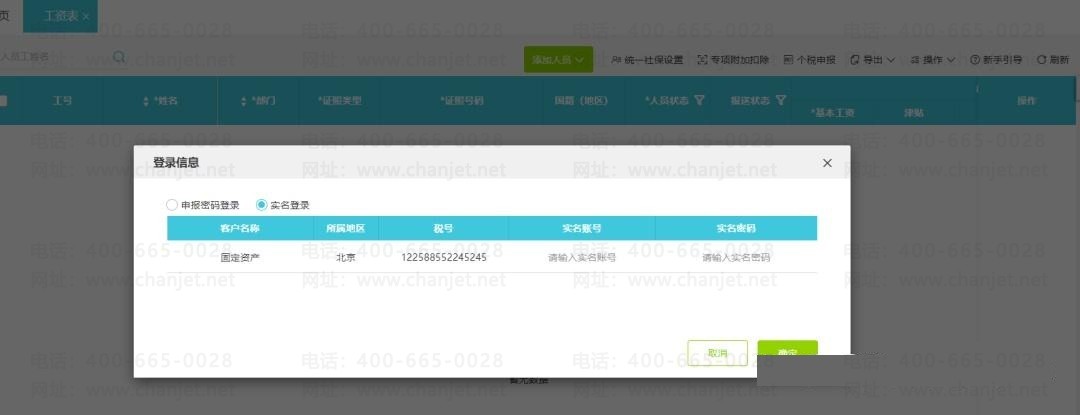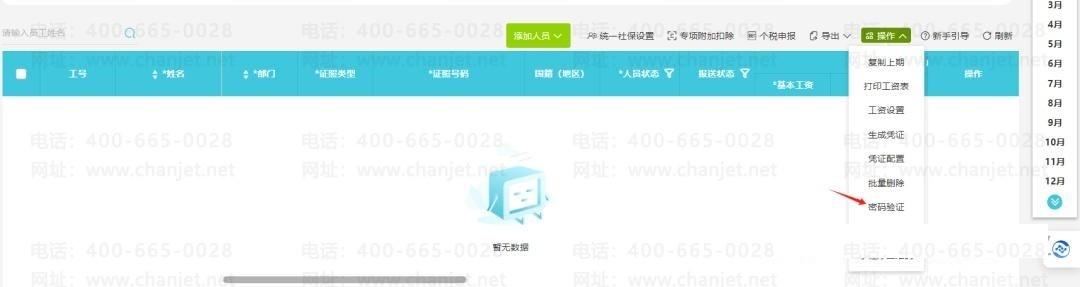 操作路径如下:进入【工资】-【工资表】页面,点击客户名称,在【操作】中选择【密码验证】,然后根据提示填写相应账号密码即可完成登录。