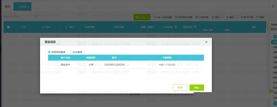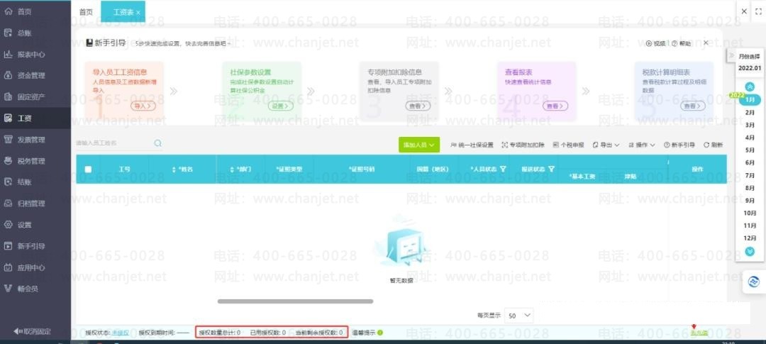 2.个税收费标准:仅需88元/年/套。您可在【工资】-【工资表】页面下方点击“去充值”,灵活购买所需个税申报账套数。