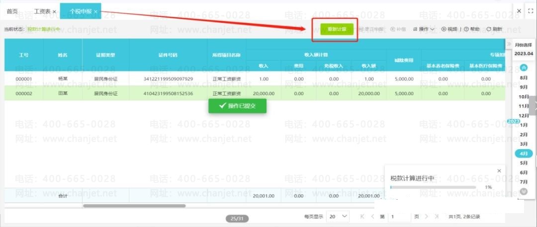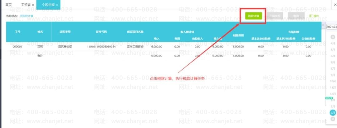 进入个税申报页面,在右侧选择所属月份,点击上方【税款计算】按钮。
