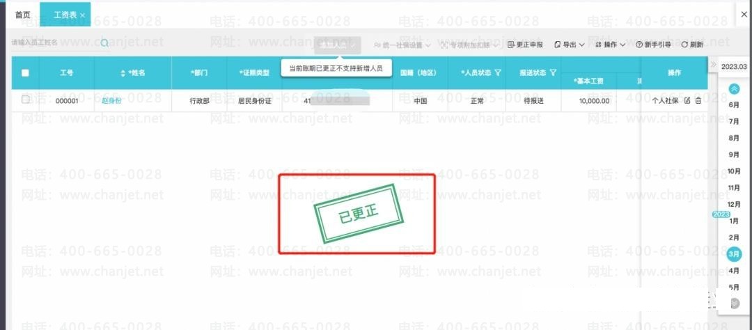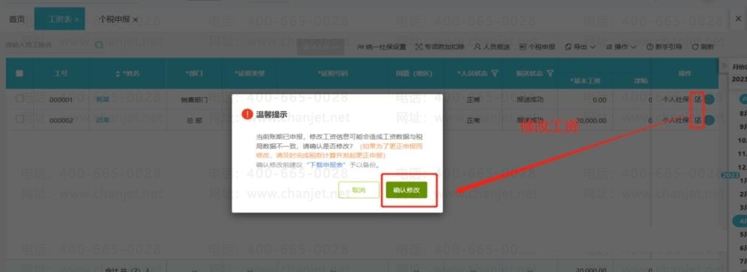 申报成功且已过征期或缴款成功后,“申报”按钮将变为“更正”。修改工资数据后,重新进行税款计算,即可点击“更正”提交修改。