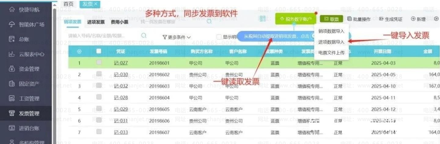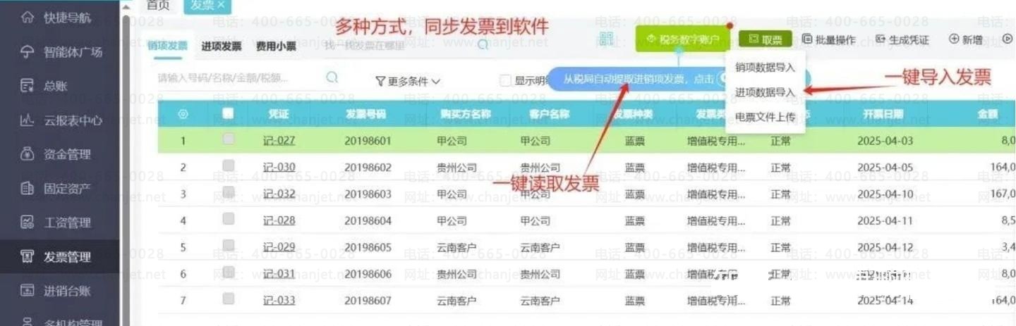 A.进销项一键导入:系统支持一键批量导入数百张进销项发票。