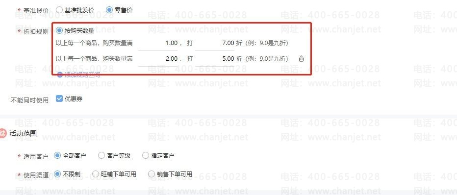 在进行销售业务时,为了促进商品的销售,所以会在不同的时间段对不同的商品进行促销,比如六月活动,零售价100元的上衣,1件7折促销,2件5折。