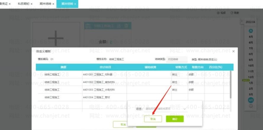 ①“工程施工”下的所有明细科目分别选择,结算方式选择转出,“主营业务成本”或者“工程结算成本”(如下图1),结算方式选择100%转入;