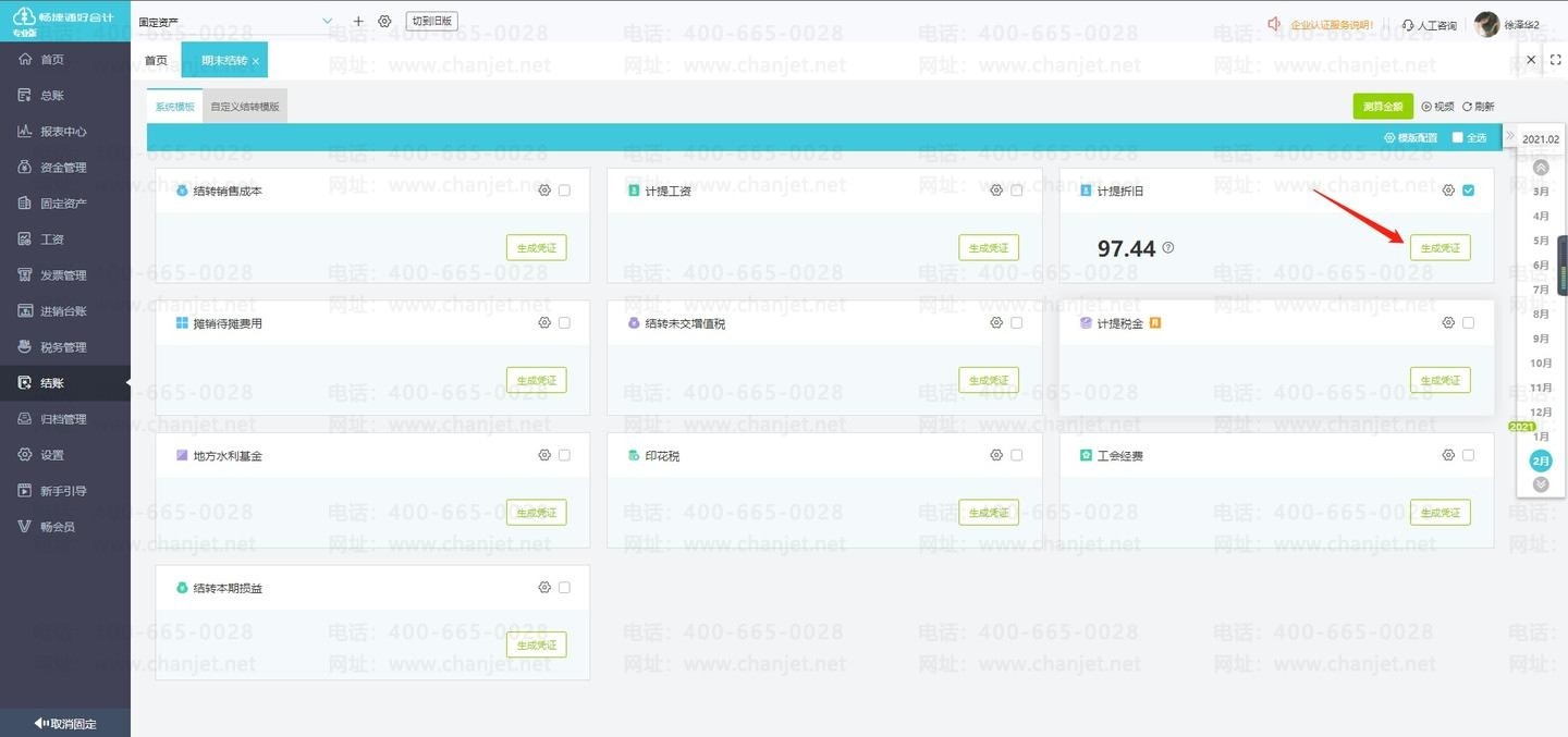 第二步:进入【结账】-【期末结转】,勾选【计提折旧】-【测算金额】,生成当月(2021年2月)折旧凭证;