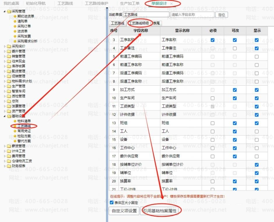 3、系统管理-单据设计-工艺路线-工艺路线明细,引用基础档案属性。