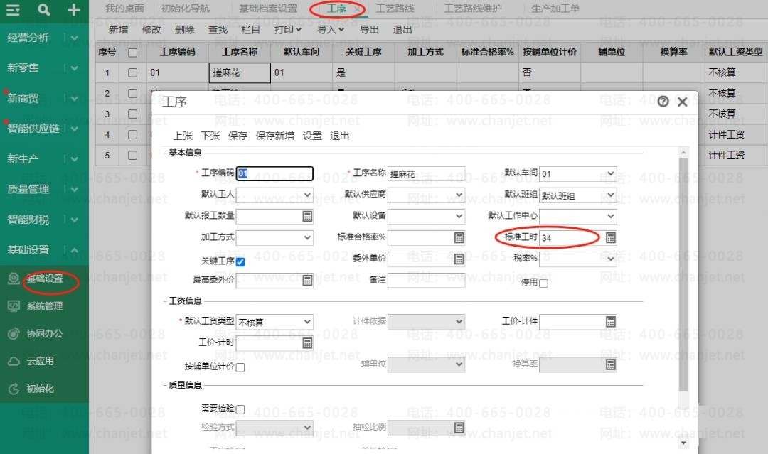 1、工序档案中录入标准工时数据:基础设置-工序-新增