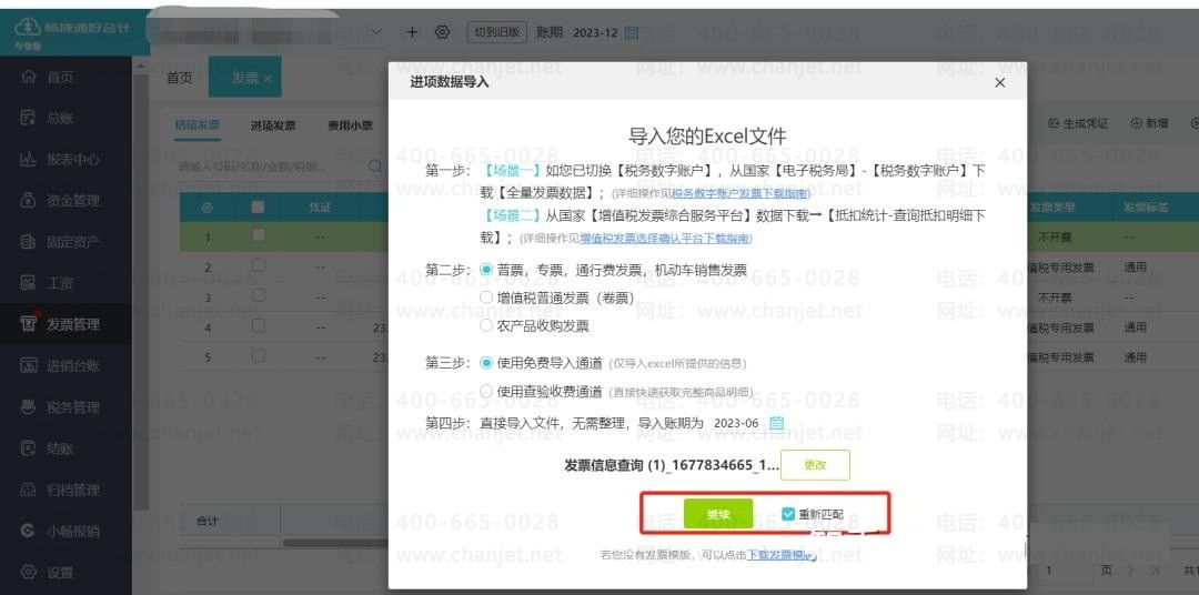 此处的账期也就是需要将发票入账的日期,如果一旦选择错误的话,会导致发票进入其他月份,如果发现如果出现导入发票成功但是进系统没找到的话一般就是导入的时候没注意账期的选择,导致发票进入了其他月份,这个时候可以根据发票号在其他月份查找。