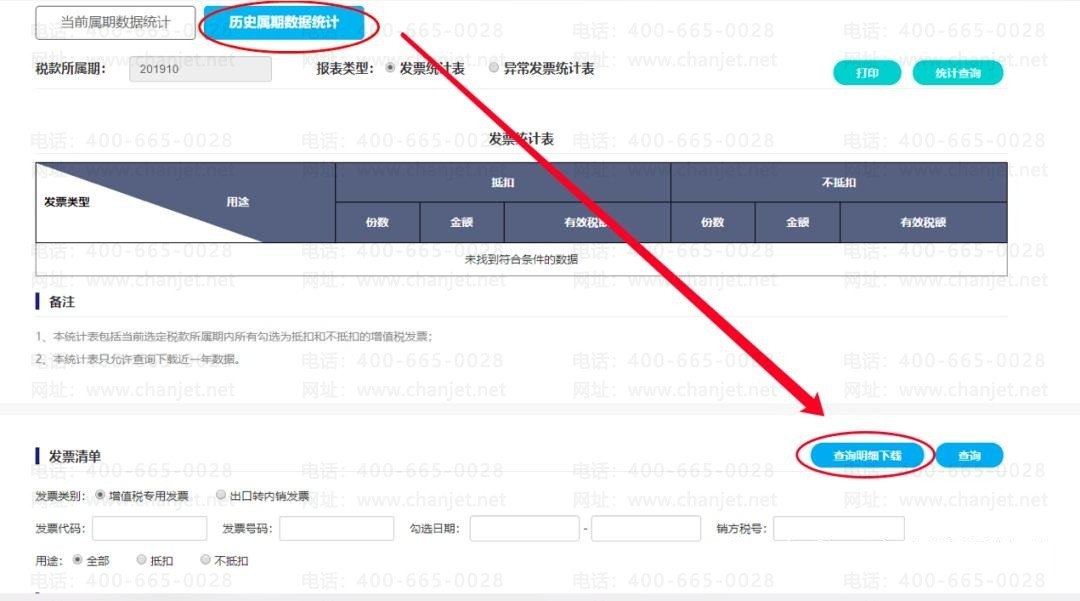 1.登录【增值税发票综合服务平台】,点击【发票管理】-【抵扣统计】,点击【历史属期数据统计】,点击年月,点击【统计查询】;最后【查询抵扣明细下载】,下载所选年月的excel文件,如下图: