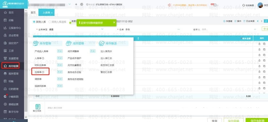 业务类型选择盘亏,把盘亏的商品录入页面,点击保存
