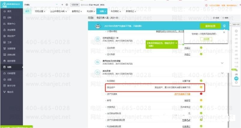 一般结账的时候【固定资产、累计折旧期末余额与清单不符】,是因为【固定资产】模块中原值和累计折旧与总账【固定资产】和【累计折旧】科目余额不一致,该提示不影响结账,可以从以下思路排查: