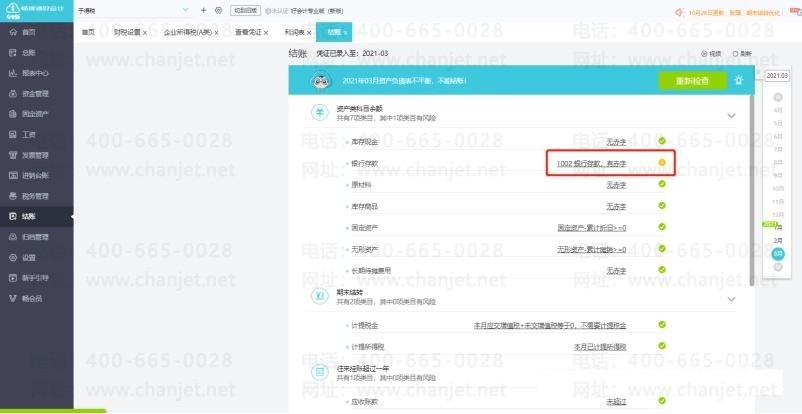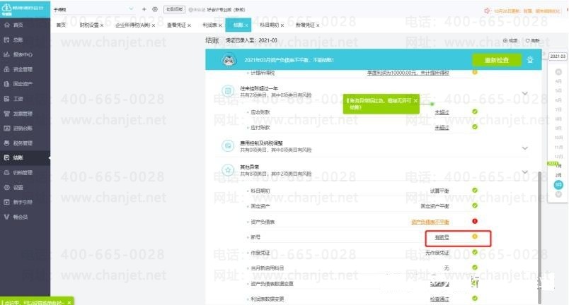 结账时若检查有异常,会用黄色叹号或红色叹号标识出来。黄色叹号标识允许结账,但需人为判断是否重要,是否需要修改。