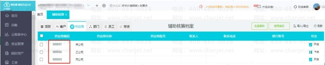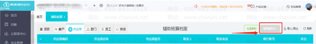 1.以供应商辅助核算档案为例,导入供应商编码没有排序,点击右侧整理编码