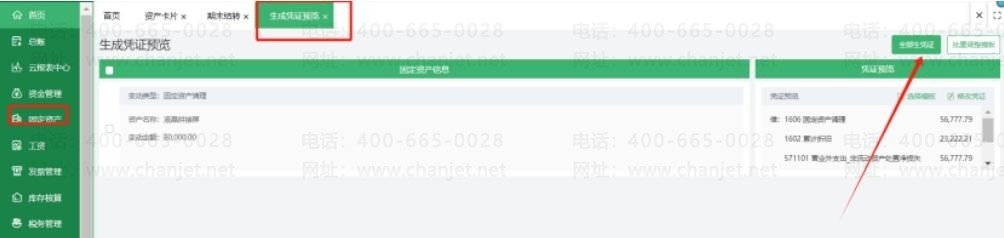 首先要做的是做一张计提折旧的凭证,该凭证可以手工新增,也可以在【结账-期末结转】中生成计提折旧的凭证,然后再到【固定资产管理】中,该固定资产录入期间后会出现一个小扫帚的图标,点击即可完成清理。