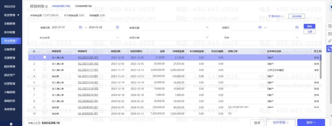 畅捷通好业财可以让你方便地进行收款核销,把它们从账本上划掉,比如预收冲应收,应收核销等。