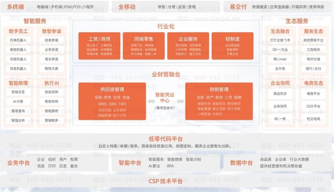模块支持按需配置,可支持采购、销售、库管、车访销、WMS、客户管理、零售管理、项目管理、总账管理、发票管理、税务管理、线上商城等。