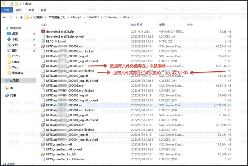 1、部分用户的数据库未被加密成功,可检查数据库目录(默认D:ChanjetTPlusStdDBServerdata)下的.mdf文件是否还存在,如还存在,则说明数据库文件未加密成功;如果都变成了.mdf.locked后缀的文件(后缀查看方法见下方PS附注),则说明被加密成功,无法恢复。