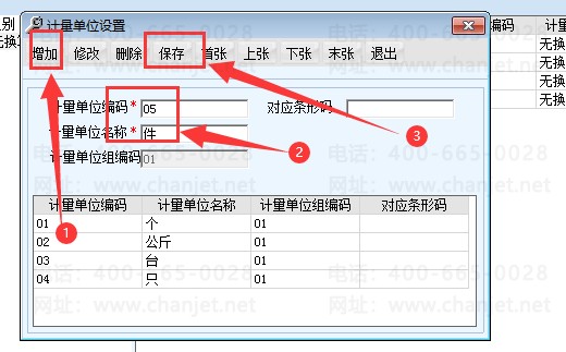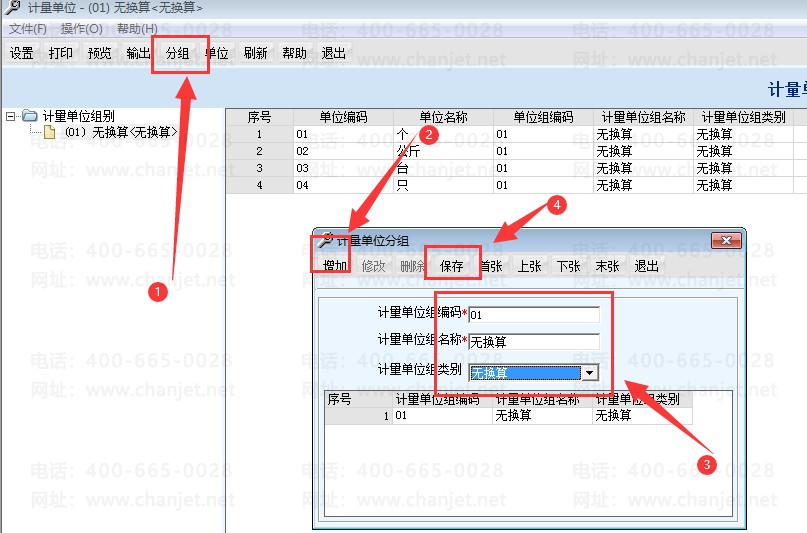 默认要先加一个分组,然后再加明细单位,先加一个没有换算关系的单位,我们点“分组”-------增加------然后编码01、名称“无换算”、下面类别也选无换算,最后点保存。