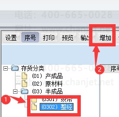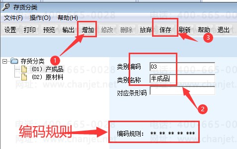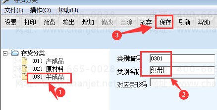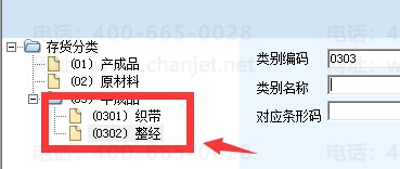 假如半成品下面加其他分类,就点做左边的01,然后点增加、编码0301、织带,然后点保存