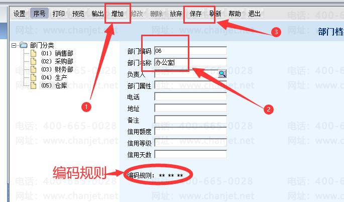 部门档案和存货分类客户分类一样,有编码规则,按照正常的编码规则即可,如下图:增加、编码名称、保存即可。