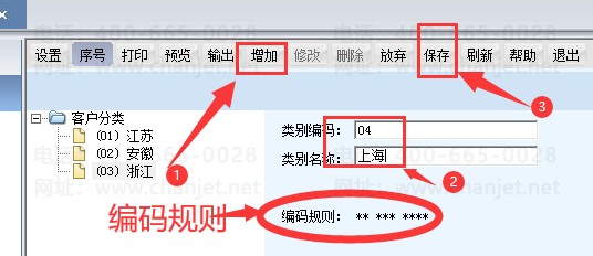 跟存货编码一样的概念,一级分类是两位,二级是三位,如下图,点增加、输入编码04、类别名次“上海”