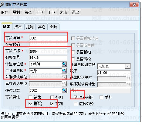 如下图是存货档案的录入,有红色型号的是必输项目,下面的存货属性也是必选项目: