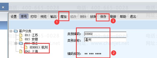 如下图,浙江下面可以再加一个分类,杭州03001,温州03002,这个就是编码规则,理解一下。这个分类不建议分的太细,除非需要按照客户分类统计,否则省份就差不多了。单据在选的时候不一定要通过分类过滤,可以直接通过关键字过滤的。