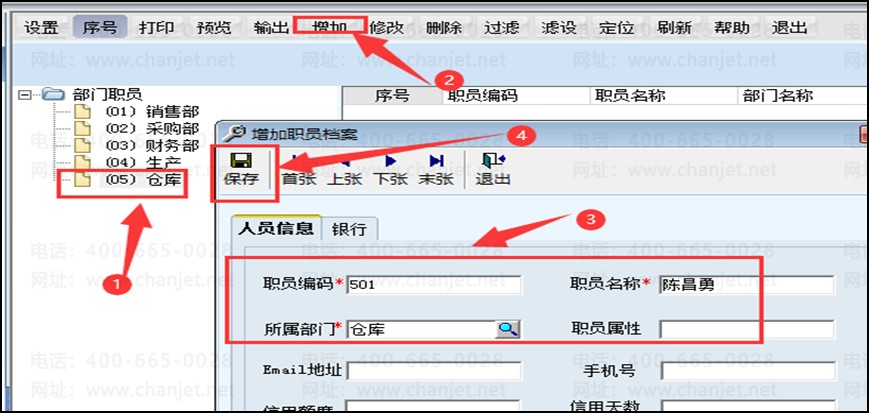 点开左边的部门,然后点增加、职员编码名称保存即可。其他资料可以选填,型号必须填写的。这个职员档案后期单据的业务员是需要填写的。