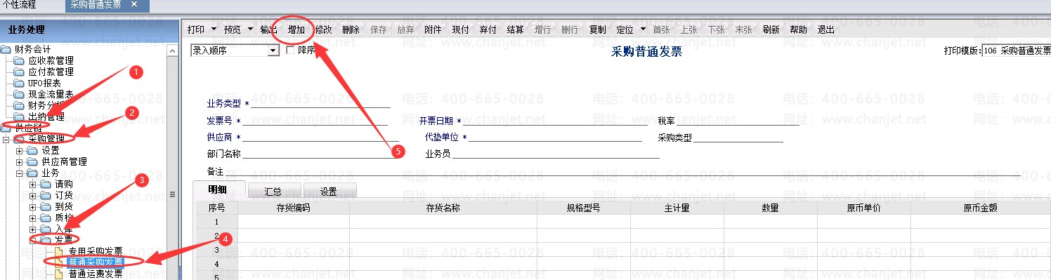 这个就是采购发票的录入和生成,如果是直接增加的话,就简单多了,直接点采购发票的增加,然后不是点“生单”,而是跟做采购入库单一样,一项一项的将明细录入进去。