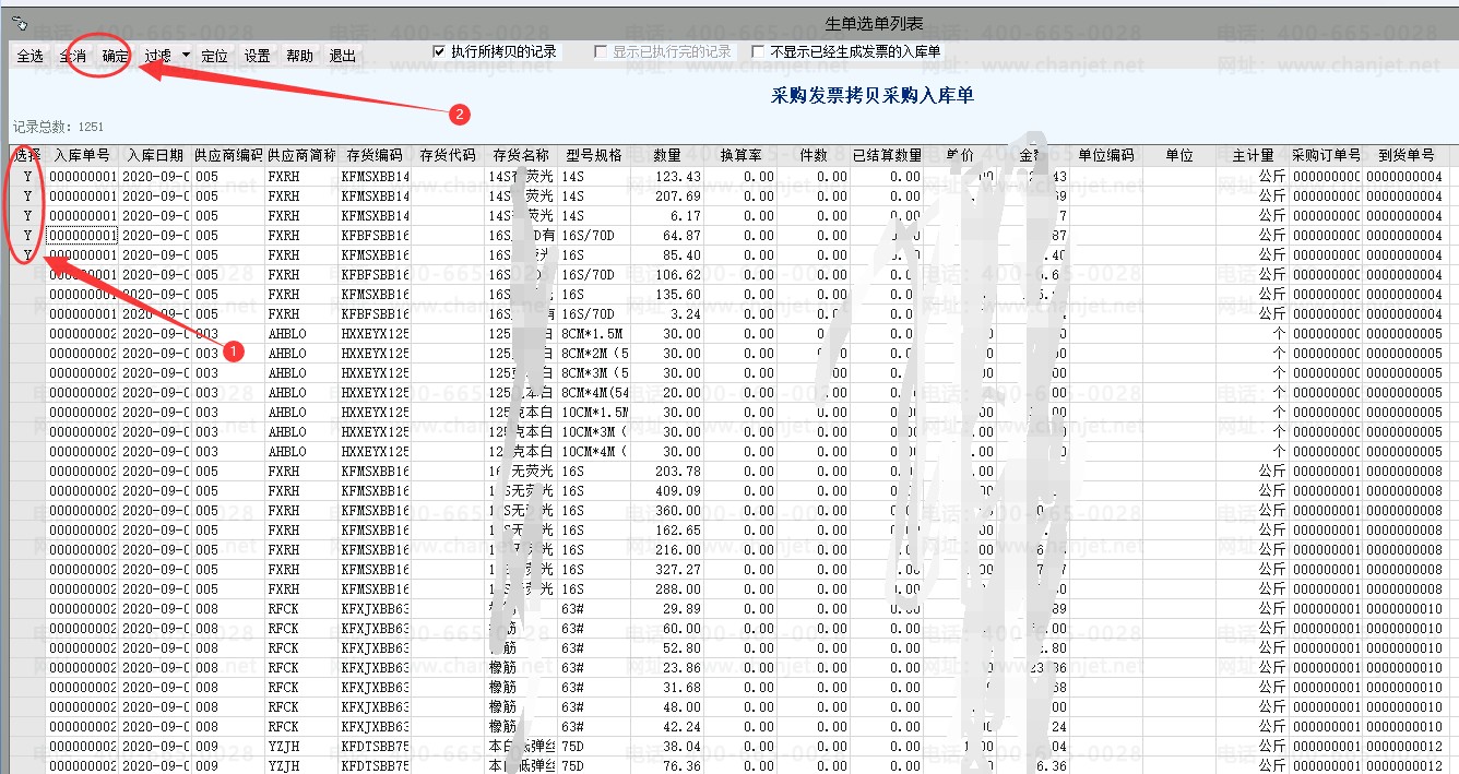 下面会过滤出很多单据的明细,选择已经开票的明细,然后点上面的确定,当然这里只能选一个供应商的,入库单号不同没关系,因为很多供应商开票的时候,是多张入库单开一张发票,甚至一个月开一张发票的。