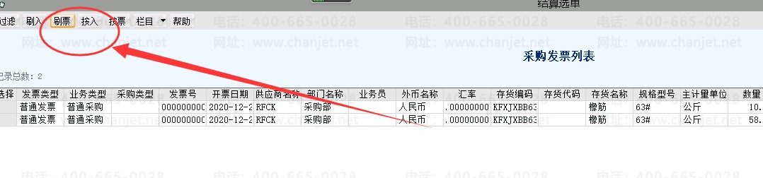 过滤点完确定之后,点上面的“刷入”下面采购入库单就出来了,然后点刷票,发票就出来了