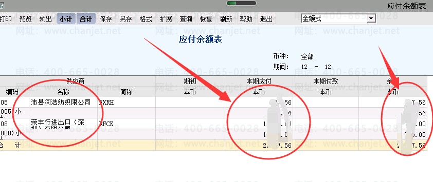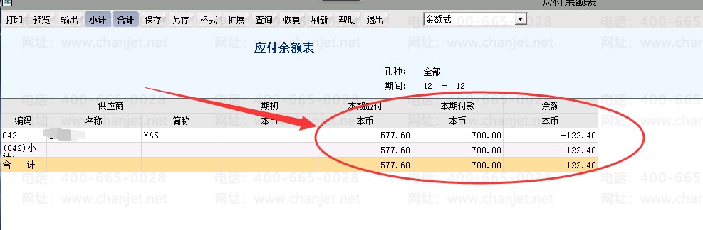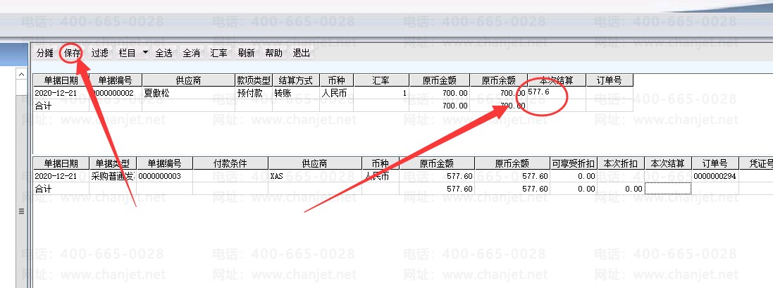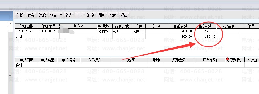 确定之后会弹出预付款单或者付款单,下面是采购发票,上面的结算金额和下面的结算金额都要手工填一下,然后点保存,冲销之后再看金额就剩下122.4 了
