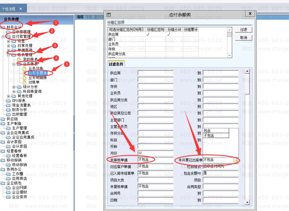先来看一下应收账款常见的查询:财务会计----应付款管理----账表查询----业务余额表,这里多个账表都可以查询,我只是举例一个,打开之后,过滤界面,下面就有一个选项,未开票已出库单。意思就是我查询的往来账款是否包含发货了,没有开票的单据,如果包含,那就是不管有没有发票,往来都有了,如果不包含,那查询出来的就仅仅是开发票立账的应付账款。勾选的时候还要选择未审核、未复核的,不然有些就查询不到了。
